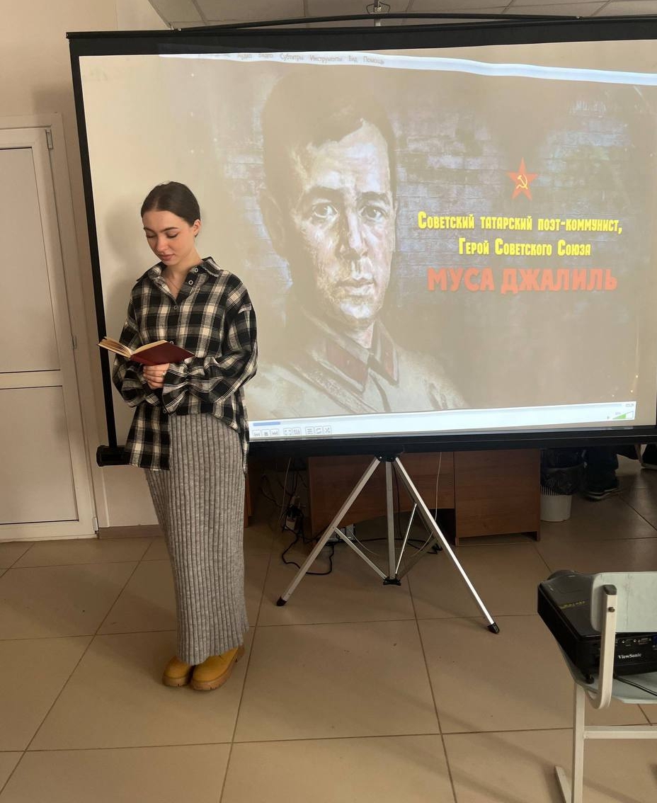 Вечер – портрет посетили студенты первого курса группы ФР-11. В ходе мероприятия прозвучали проникновенные строки о любви к Родине, о стойкости духа, о вере в победу и песни на стихи Мусы Джалиля на родном и русском языках. Особое внимание было уделено истории создания «Моабитских тетрадей» — поэтического завещания, написанного в застенках тюрьмы. В гитлеровских застенках Муса Джалиль написал сотни стихов, до потомков дошли 115 из них. Эти стихи, преодолев все преграды, дошли до читателей и стали бессмертным свидетельством мужества и таланта.